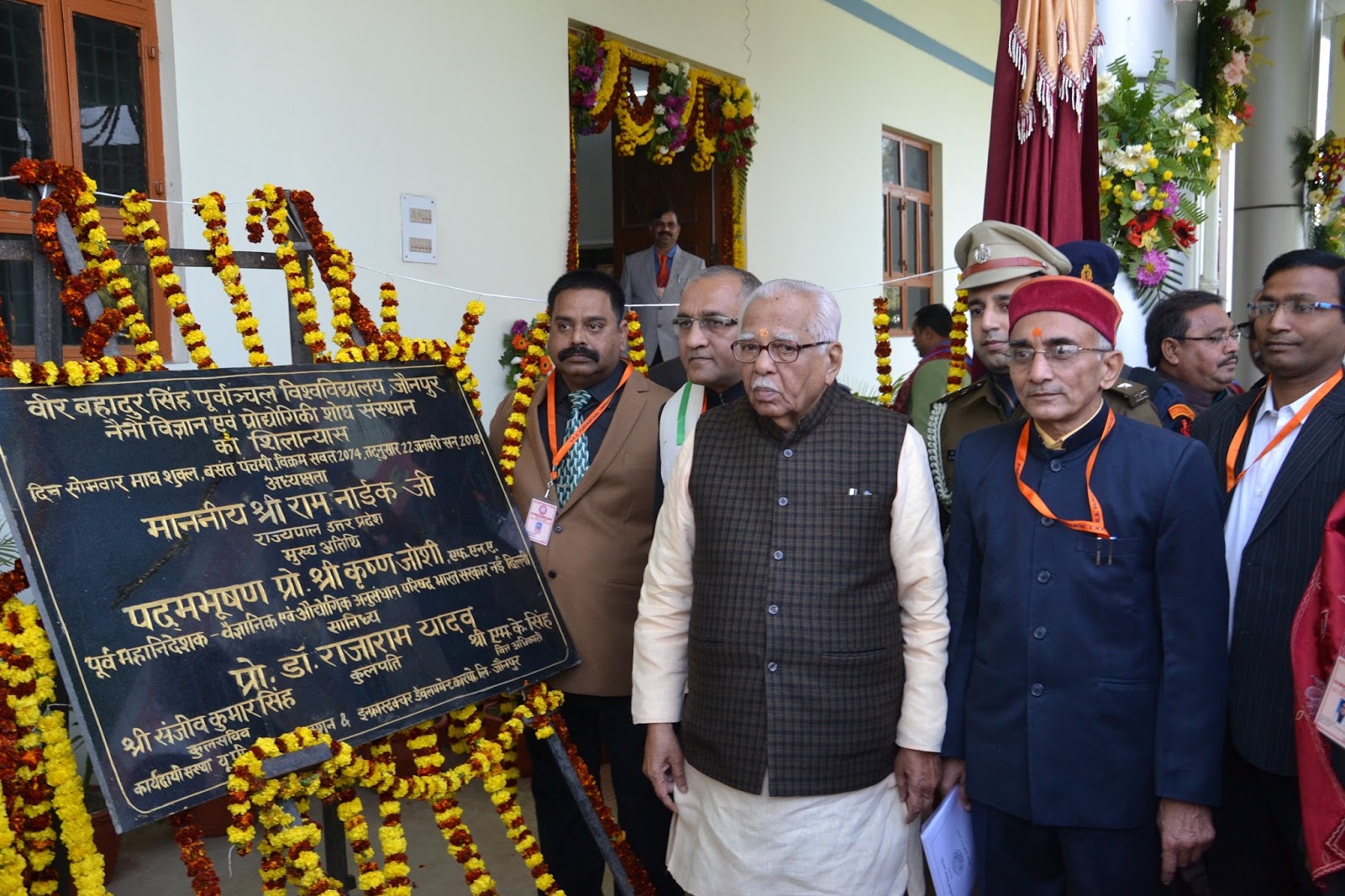 संगाष्ठी भवन परिसर में प्रदेश के पूर्व राज्यपाल श्री राम नाईक द्वारा नैनो विज्ञान एवं प्रौद्योगिकी संस्थान एवं वैकल्पिक ऊर्जा शोध संस्थान का शिलान्यास किया। इस अवसर पर कुलसचिव संजीव सिंह व वित्त अधिकारी एम.के. सिंह ने बुके देकर राज्यपाल का स्वागत किया।