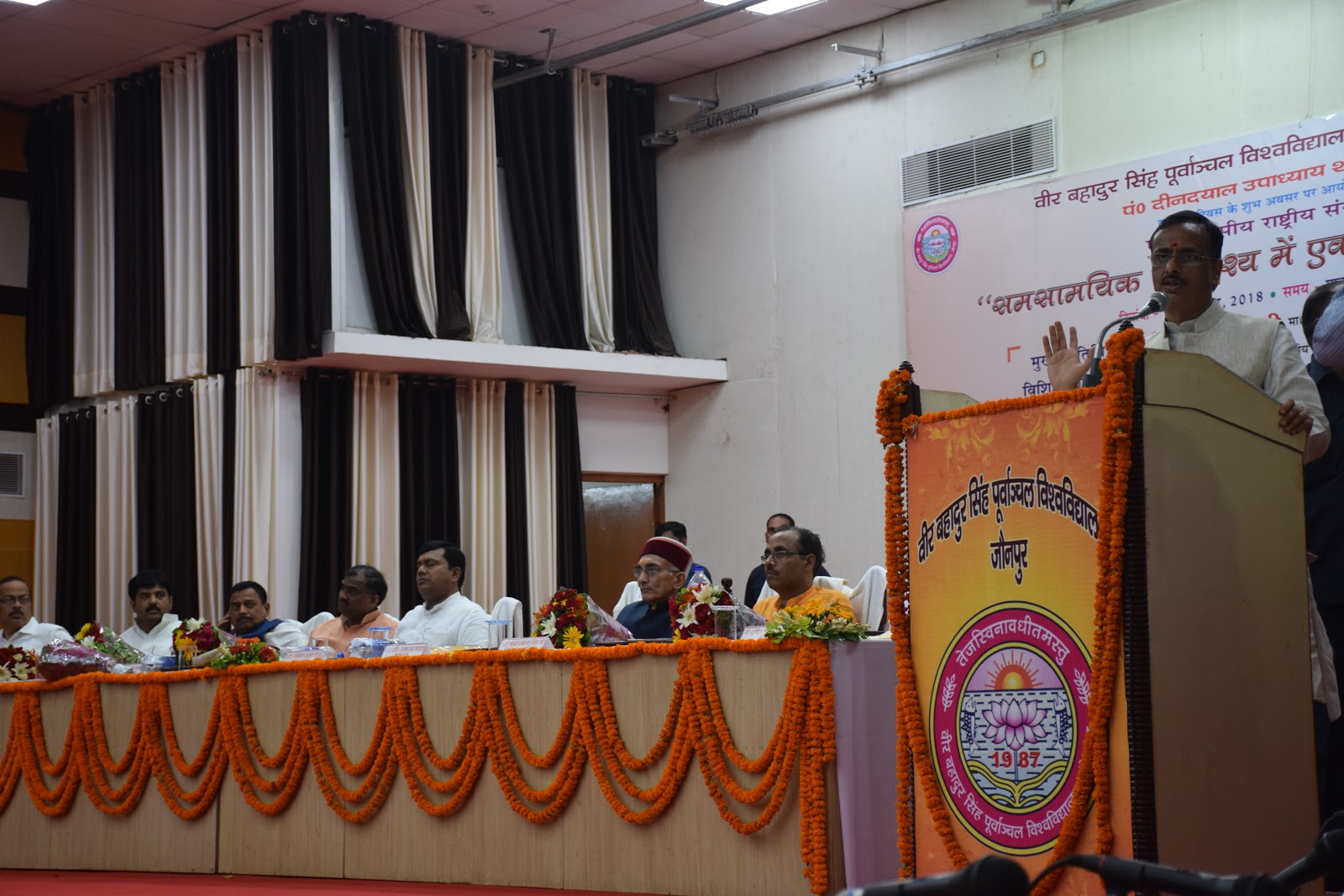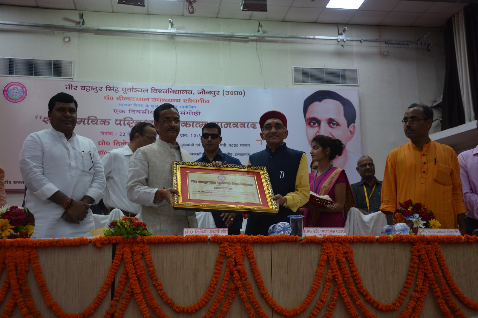 पूर्वांचल विश्वविद्यालय जौनपुर के महंत अवैद्यनाथ संगोष्ठी भवन में शनिवार को पंडित दीनदयाल उपाध्याय शोधपीठ की ओर से समसामयिक परिदृश्य में एकात्म मानववाद विषयक राष्ट्रीय संगोष्ठी का आयोजन किया गया। इस अवसर पर उप्र के उपमुख्यमंत्री एवं उच्च शिक्षामंत्री प्रो दिनेश शर्मा ने बतौर मुख्य अतिथि कहा कि विश्वविद्यालय रोजगारपरक शिक्षा प्रदान करें ताकि विद्यार्थियों को नौकरी का संकट न हो। इसी चलते पूरे प्रदेश के विश्वविद्यालयों में पं दीनदयाल उपाध्याय शोध पीठ की स्थापना की जा रही है, क्योंकि पंडितजी का भी यही मकसद था। उन्होंने कहा कि प्रदेश में शिक्षकों की स्थाई रूप से नियुक्ति की गई ताकि पठन-पाठन गुणवत्तापूर्ण हो सके। उन्होंने कहा कि जब पढ़ाई होगी तभी नकल नहीं होगी इसलिए इस पर जोर दिया गया है।