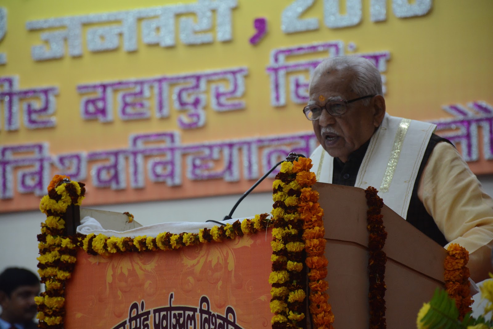 इस अवसर पर बतौर अध्यक्षीय संबोधन करते हुए विश्वविद्यालय के पूर्व कुलाधिपति एवं पूर्व राज्यपाल श्री राम नाईक जी ने कहा की गोल्ड मेडल और उपाधि पाने वाले विद्यार्थियों को हर क्षेत्र में जागरूक रहने की जरूरत है, क्योंकि अब आप के पँखोँ मेँ ताकत आ गई है और आकाश में उड़ान के दौरान काफी प्रतिस्पर्धा का सामना करना होगा। उन्होंने विद्यार्थियों से कहा के दीक्षांत में शपथ लेना सरल है लेकिन उसे निभाना कठिन है। इसे निभाने के लिए दृढ़ इच्छाशक्ति का होना बहुत जरूरी है । उन्होंने सलाह दिया कि आप प्रमाणिकता एवं पारदर्शिता के साथ आगे बढ़ो , असफलता के बारे में आत्मनिरीक्षण करो, अपने को अपडेट रखो तो उपलब्धियां आपके चरण चूमेगी। उन्होंने पूरे प्रदेश में उच्च शिक्षा का विश्लेषण करते हुए कहा कि प्रदेश के विश्वविद्यालय में गोल्ड मेडल और उपाधि पाने वालों में 51 फ़ीसदी छात्राएं हैं जोकि महिला सशक्तिकरण का उदाहरण प्रस्तुत करतीँ है । उन्होंने कहा कि सन 2000 में सर्व शिक्षा अभियान की बुनियाद अटल बिहारी वाजपेई की सरकार ने रखी थी और वर्तमान की मोदी सरकार ने बेटी बचाओ ,बेटी पढ़ाओ को बढ़ावा दिया, जिसका असर अब देखने को मिल रहा है। उन्होंने कहा कि पूरे प्रदेश के विश्वविद्यालयों से हटकर दो बातें वीर बहादुर सिंह पूर्वांचल विश्वविद्यालय में देखने को मिलती है, पहला खेल के क्षेत्र में और दूसरा केंपस प्लेसमेंट के क्षेत्र में आगे है जो कि सराहनीय कार्य है।