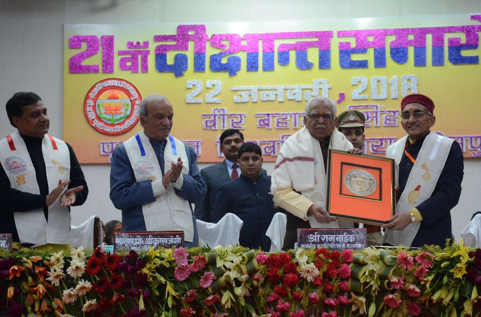 इस अवसर पर प्रदेश की राज्यपाल एवं कुलाधिपति श्रीमती आनंदीबेन पटेल ने विश्वविद्यालयों में शिक्षा की सुचिता पर जोर देते हुए कहा कि शिक्षक नियमित क्लास लें। विश्वविद्यालयों में जब प्रवेश, परीक्षा और परीक्षाफल की तिथि निर्धारित हो जाएगी तो शिक्षा व्यवस्था अपने आप सुधर जाएगी। महिला सशक्तिकरण पर जोर देते हुए उन्होंने कहा कि विश्वविद्यालय में 73 फीसदी लड़कियां और 27 फीसदी लड़के गोल्ड मेडल पाएं हैं। इससे साबित होता है कि महिलाएं पुरुषों से आगे हैं। मैंने उत्तर प्रदेश में नौ विश्वविद्यालयों की कुलपति महिलाओं को बनाया। उन्होंने कहा कि शोध के क्षेत्र में हमे विशेष जोर देने की जरूरत है। पेटेंट न होने के कारण विश्व के अन्य देश हमसे आगे हो जा रहे हैं। उन्होंने जर्मनी को उदाहरण देते हुए कहा कि वहां गर्भवती माताओं को शिक्षा दी जाती है ताकि उसका बच्चा पैदा होने के बाद शिक्षित और संस्कारित बने। इस काम का प्रमाण हमारे यहां महाभारत काल का अभिमन्यु है। उन्होंने कहा कि विद्यार्थियों के डिग्रियों को डिजिलॉकर में रखने का एकमात्र उद्देश्य यह है कि उसके साथ किसी भी प्रकार की छेड़छाड़ न हो पाए और साथ में ही वह इसके माध्यम से अपनी डिग्री को देश में कहीं से भी देख सकेंगे। उन्होंने कहा कि विश्वविद्यालय के शिक्षकों को तकनीकी के क्षेत्र में विद्यार्थियों का भी उपयोग करना चाहिए जिससे कि विश्वविद्यालय के विकास में उनकी भी सहभागिता हो। उन्होंने कहा कि गरीब बच्चों को शिक्षा का अधिकार दिलाने के लिए विश्वविद्यालयों को आंगनबाड़ी केंद्रों तक भेजा गया। प्रदेश में वृक्षारोपण कराने का उद्देश्य भी पर्यावरण को सुरक्षित करना है। हमें समस्याओं के मूल को पहचानना होगा और प्रयास करके इसका निदान करना होगा।