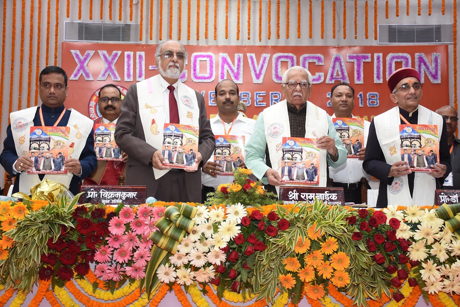 इस अवसर पर प्रदेश की राज्यपाल एवं कुलाधिपति श्रीमती आनंदीबेन पटेल ने कहा कि देश में 65 फीसदी युवा जनसंख्या है। इसका अधिकतर भाग विश्वविद्यालय से होकर गुजरता है। युवाओं की मेधा का सकारात्मक उपयोग समाज के लिए विश्वविद्यालय को करना चाहिए। हमें विदेशों की नकल करने से अच्छा है युवाओं की सोच को विकसित कर उसका उपयोग देशहित में किया जाए। देश के प्रधानमंत्री श्री नरेंद्र मोदी की भी यही चिंता रहती है। उन्होंने कहा कि प्रधानमंत्री कौशल विकास योजना से युवकों को स्वावलंबी बनाया जा रहा है, जब तक युवा स्वावलंबी नहीं बनेंगे तब तक देश आत्मनिर्भर नहीं बन सकता। देश में वृद्धाश्रम की बढ़ती संख्या पर उन्होंने चिंता व्यक्त करते हुए कहा कि बच्चों, मां का सम्मान करना सीखों, क्योंकि बचपन में कितने कष्ट सहकर मां ने आपका पालन-पोषण किया है। मां-पिता बुढ़ापे में आपसे दूर हो, शिक्षा का सही मायने यह नहीं है। उन्होंने आंगनबाड़ी की प्रशंसा करते हुए कहा कि मां का असली रूप वहां देखने को मिलता है, वहां 50-50 बच्चों को कार्यकर्ती कैसे संभालती हैं, हमें उनसे सीख लेने की जरूरत है। उन्होंने कहा कि शोध की डिजाइन और प्रस्तुतीकरण वैश्विक स्तर का हो। उन्होंने स्वास्थ्य पर चर्चा करते हुए कहा कि इसके लिए योग और मोटे अनाज का सेवन जरूरी है। इसकी जागरूकता के लिए स्कूल, कालेज और विश्वविद्यालय को योगदान देना होगा। छोटे बच्चों को दीक्षांत में बुलाने का मतलब उनके आगे के स्वप्न को साकार करना है। जी-20 की सोच को विस्तार से बताते हुए उन्होंने कहा कि इससे रोजगार के अवसर बढ़ेंगे। समाज से दहेज की विकृति दूर करने के लिए उन्होंने विद्यार्थियों को दहेज न लेने का संकल्प दिलाया।