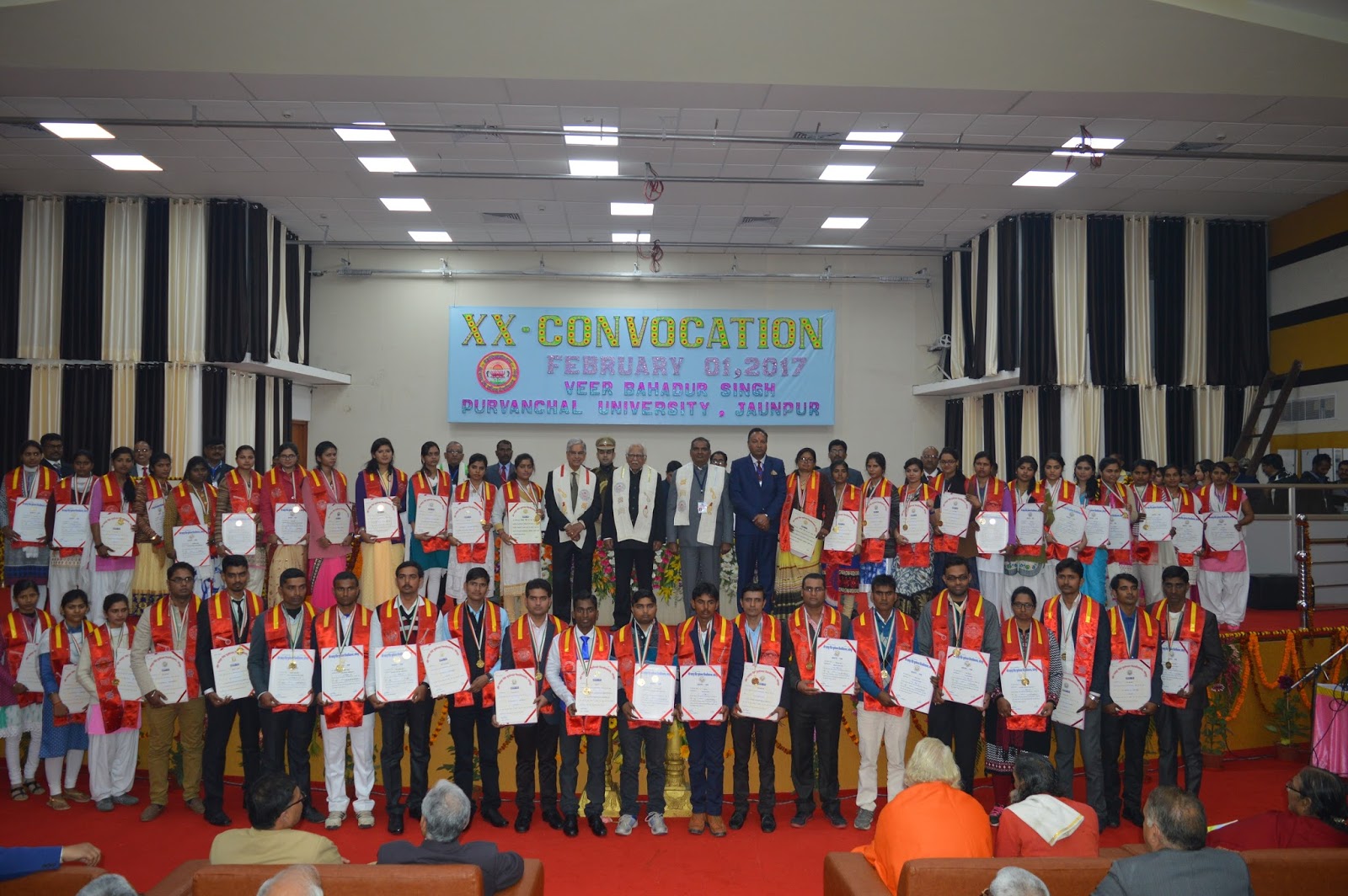 वीर बहादुर सिंह पूर्वांचल विश्वविद्यालय जौनपुर का बीसवां दीक्षान्त समारोह 01 फरवरी, 2017 को बसन्त पंचमी के शुभ अवसर पर आयोजित किया गया। समारोह की अध्यक्षता पूर्व राज्यपाल उत्तर प्रदेश एवं माननीय पूर्व कुलाधिपति श्री रामनाईक ने की। इस अवसर पर उपाधिधारकों को बधाई देते हुए उन्होंने कहा कि लक्ष्य प्राप्ति के लिए सदैव प्रयासरत रहें। अपने लक्ष्य को कभी भी आंखों से ओझल न होने दें। उन्होंने कहा कि चिड़ियों का घोसला बनाने, अपने अण्डे को पालने एवं बच्चों को दाना चुगाने के बाद एक समय ऐसा भी आता है जब उनके पंखों में ताकत आती है और वे खुले आसमान में विचरण करते हैं। आप इससे सबक लें क्योंकि आज आपके पंखों में ताकत है एवं आप उड़ान के लिए तैयार हैं। आपके आकाश में कड़ी प्रतिस्पर्धा है। अतः कठोर परिश्रम से ही आपको सफलता हासिल होगी। उन्होंने कहा कि कभी-कभी शुरूआती दौर सफलताएं नहीं मिलती है तो उससे निराश न हों। ऐसे वक्त पर आत्मविश्लेषण करें। निश्चित रूप से आपको आगे जाने की शक्ति मिलेगी। 2025 में पूरी दुनिया में सबसे ज्यादा युवा भारत में होंगे। हम इस अवसर का लाभ उठायें और देश को अपना सर्वोच्च अर्पित करें।
