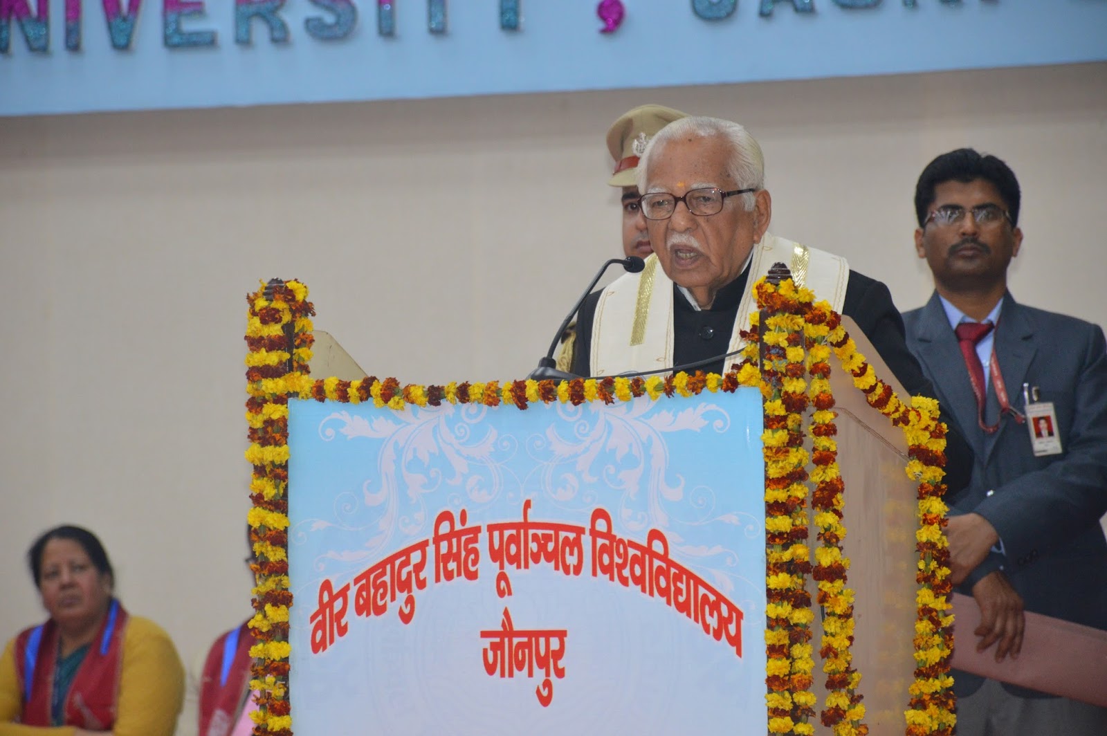 विश्वविद्यालय की प्रगति आख्या प्रस्तुत करते एवं अतिथियों का स्वागत करते हुए कुलपति प्रो. पीयूष रंजन अग्रवाल ने कहा कि पूर्वी उत्तर प्रदेश के इस अंचल में अवस्थित विश्वविद्यालय परिक्षेत्र की अनेक भौगोलिक, सामाजिक, शैक्षणिक, सांस्कृतिक विशिष्टताएँ हैं। यहाँ के विद्यार्थियों में असीम उत्साह एवं क्षमता है। उन्हें जीवन के प्रति आधुनिक विचारों के साथ नये-नये तकनीकी, आर्थिक एवं सामाजिक परिवर्तनों से प्रशिक्षित करते हुए जीवन की ऊँचाईयों को छूने के लिए प्रेरित करने की आवश्यकता है। बौद्धिक विकास की यह प्रयोगशाला, वीर बहादुर सिंह पूर्वा´चल विश्वविद्यालय अपने उद्देश्य एवं कर्Ÿाव्य के प्रति कटिबद्ध रहते हुए निरंतर उच्च शिक्षा के क्षेत्र में एक प्रकाश स्तम्भ की भाँति मार्ग प्रशस्त करता रहेगा। कार्यक्रम के पूर्व अध्यक्ष, मुख्य अतिथि एवं कुलपति द्वारा महात्मा गांधी एवं वीर बहादुर सिंह की प्रतिमा पर पुष्पांजलि अर्पित किया गया। दीप प्रज्ज्वलन के साथ समारोह की शुरूआत श्री राज्यपाल उत्तर प्रदेश द्वारा की गयी। विश्वविद्यालय के विद्यार्थियों ने कुलगीत की प्रस्तुति की। स्नातक एवं परास्नातक स्तर पर सर्वोच्च अंक प्राप्त करने वाले 59 विद्यार्थियों को मा. कुलाधिपति ने स्वर्ण पदक से सम्मानित किया। इस अवसर पर 324 पीएचडी के विद्यार्थियों को उपाधि प्रदान की गयी। इस अवसर पर महात्मा गांधी काशी विद्यापीठ के कुलपति प्रो. पृथ्वीश नाग, कार्य परिषद एवं विद्या परिषद के माननीय सदस्यगण, कुलसचिव डाॅ. देवराज, वित्त अधिकारी एम.के. सिंह, डाॅ. अजय प्रताप सिंह, उप कुलसचिव संजीव सिंह, टी.बी. सिंह, डा. देवेश उपाध्याय, डा. सर्वानंद पाण्डेय, डा. दुर्गा प्रसाद अस्थाना, डा. एसपी ओझा, डा. विजय तिवारी, सुरेंद्र त्रिपाठी, डा. मानस पाण्डेय, डा. अविनाश पाथर्डीकर, डा. मनोज मिश्र, डा. दिग्विजय सिंह राठौर, डा. अवध बिहारी सिंह, डा. सुनील कुमार सहित महाविद्यालयों के प्रबन्धक, महाविद्यालयों के प्राचार्य, जनप्रतिनिधि, शिक्षक, अधिकारी, कर्मचारी, विद्यार्थीगण एवं अभिभावक उपस्थित रहे।